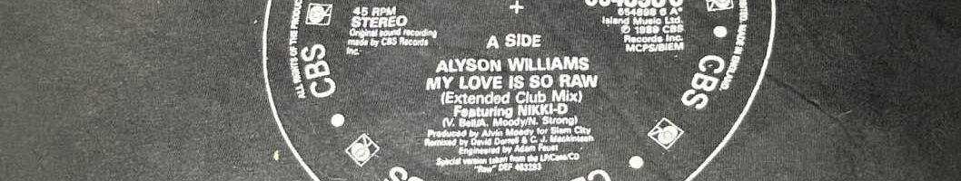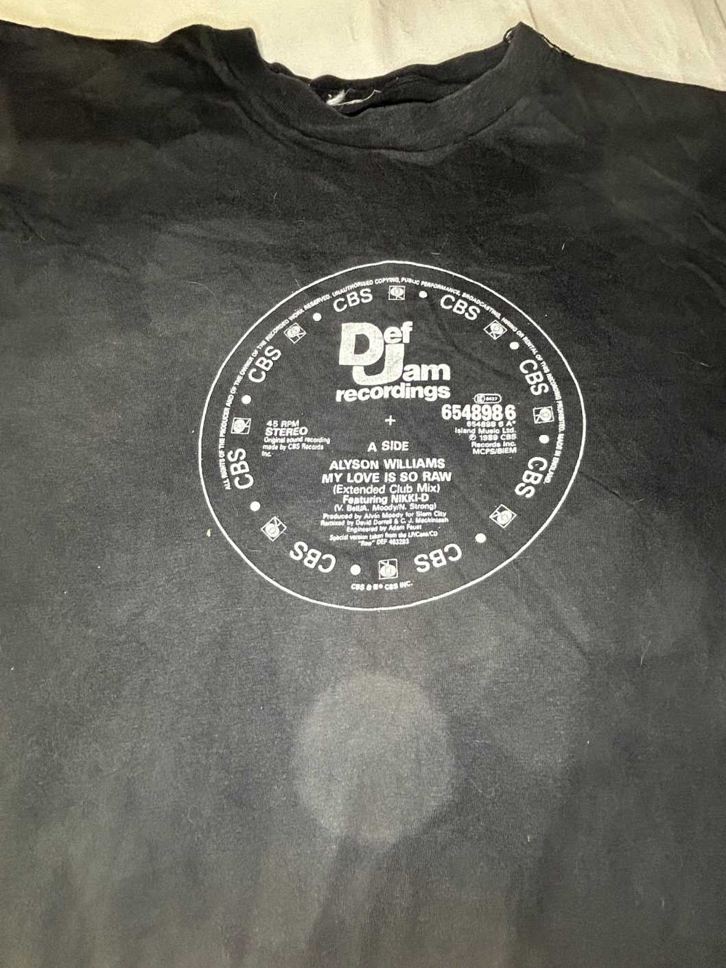 Vintage worn Def Jam T-Shirt XL Black featuring Alyson Williams ‘My Love Is So Raw’ label copy on Def Jam via CBS.