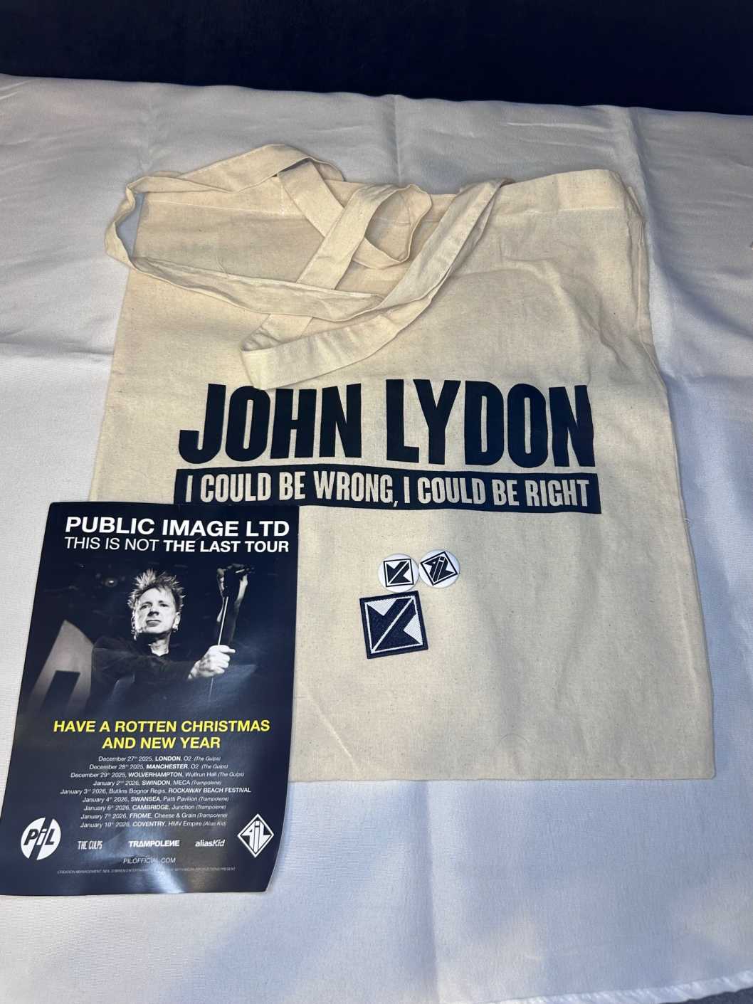Lovely set of a bag, 2 badges (2cm) and a patch badge from the I Could Be Wrong, I Could Be Right Tour 2025/6. There’s also a flyer in there. Brand new.