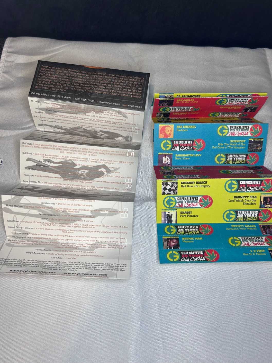 Used to promote the album by Roots Manuva, these cigarette papers were given away to record industry people. In amongst the lot, there is also some reefer cardboard ‘filter’ from Greensleeves Records and Ninjakinz.