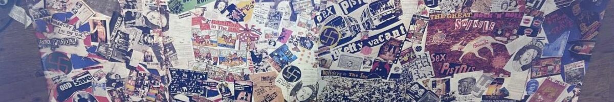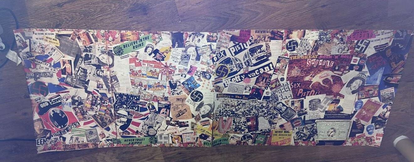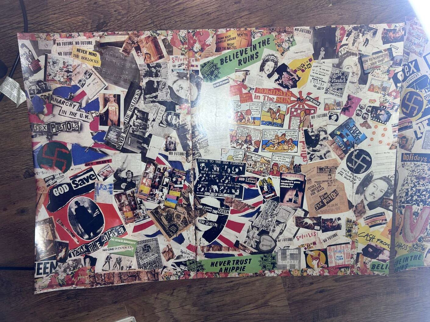 A 1983 poster in two parts, each approximately 62cm x 89cm, with image depicting being Jamie Reid’s mural created for a 1983 Sex Pistols exhibition. Both in NM condition.
